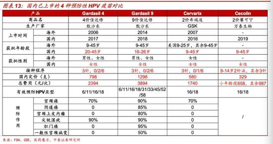 不过,一家专注医药行业投资的基金负责人何瑞(化名)也提到,根据全球数据,大约有70%的宫颈癌、将近90%的肛门癌和很大比例的口咽癌、外阴癌、阴道癌和阴茎癌是由HPV16和18两个基因型导致,目前上市的疫苗都包含这两个基因型,20%宫颈癌由HPV31、33、45、52、58这几个基因型导致,只有9价疫苗包含这几个基因型。“如果不考虑成本的话,推荐9价疫苗,亚型更多,能预防更多宫颈癌。但9价疫苗受产能限制,年龄限制,这些因素也要考虑。”