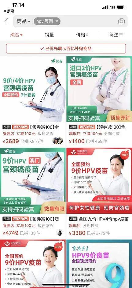 2020年夏天,拼多多将HPV疫苗加入其“百亿补贴”计划。过去该计划中销售的多是iPhone、SK-II神仙水等高热度标品。HPV疫苗加入其中,无疑象征着其跻身“顶流”消费品行列。而在此前就已经布局入场的阿里、京东也趁热度加大了HPV疫苗的推广力度,为HPV疫苗市场再添一把火。