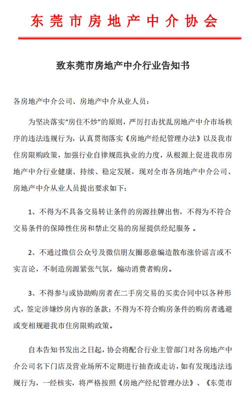 4月23日,广东省东莞市房地产中介协会发布《致东莞市房地产中介行业告知书》,要求东莞房地产中介不得为不具备交易转让条件的房源挂牌出售,不得为不符合交易条件的保障性住房和禁止交易的房屋提供经纪服务;不得通过微信公众号及微信朋友圈恶意编造散布涨价谣言或不实言论,不得制造房源紧张气氛,煽动消费者购房;不得参与或协助购房者在二手房交易的买卖合同中以各种形式,签定涉嫌炒房内容的条款;不得为不符合购房条件的购房者逃避或变相规避东莞住房限购政策等内容。