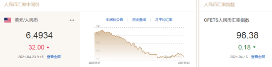 4月23日,中间价报6.4934,下调32点,上一交易日中间价报6.4902,在岸人民币上一交易日收报6.4888。