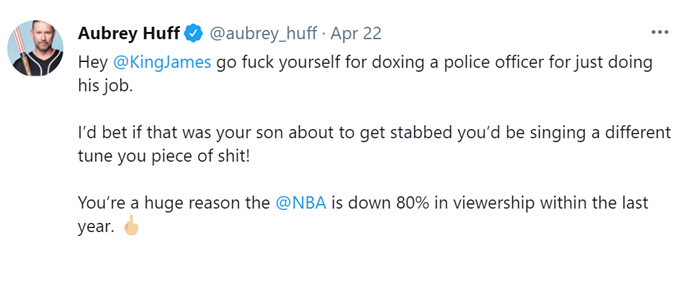 在第一条推文中,霍夫言辞激烈地攻击说:“嘿詹姆斯,去你的。那个警察只是做了他的工作。我敢打赌,如果将要被刺伤的是你儿子,你的话肯定不是这么说了!你是NBA去年收视率下降80%的一个重要原因。”
