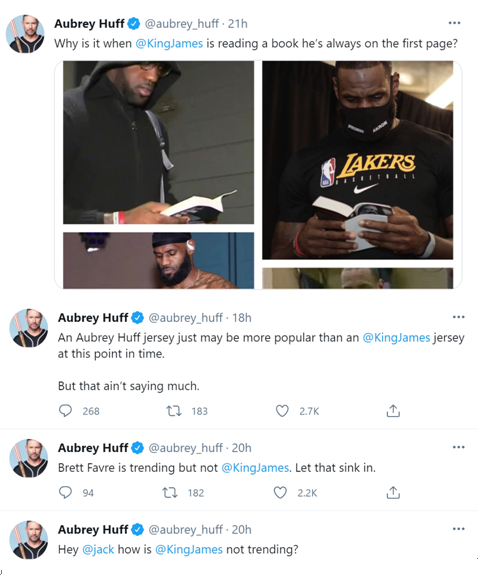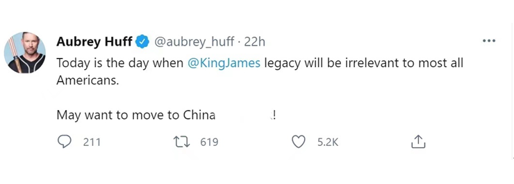 “今日俄罗斯”(RT)称,当地时间21日,美国前棒球明星奥布里·霍夫连发7条推文,疯狂讽刺詹姆斯。其中一条他称,詹姆斯发布上面的推文是因为他“可能想搬去中国”。