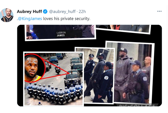 接着,他还贴出了詹姆斯在不同场合被私人安保全方位保护的图片,一通讽刺。