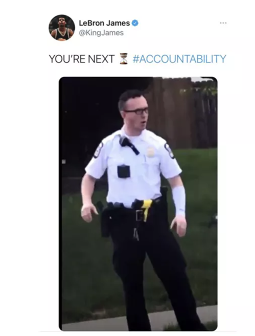 当地时间21日,詹姆斯在推特上发布了一张开枪打死15岁黑人女孩基亚·布莱恩特的俄亥俄州哥伦布市警员尼古拉斯·雷登(Nicholas Rearden)的照片,并写道“你是下一个”,还贴上了“追究责任”的标签。