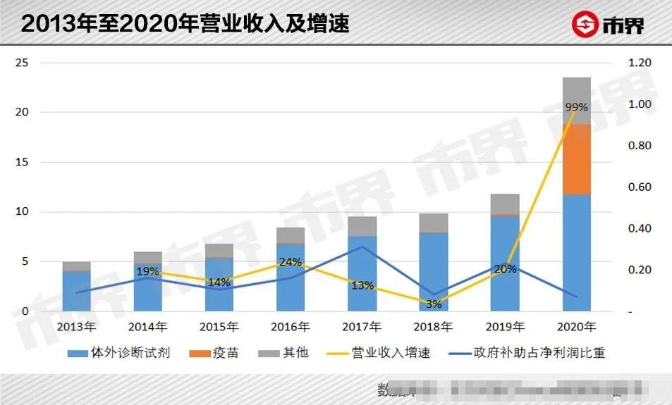 2013年至2020年,公司收入由4.99亿元上涨至23.54亿元,净利润由0.8亿元上涨到6.8亿元,在生物医药板块一直排在20名以外。值得一提的是,政府补助对公司净利润还贡献了不少,近两年,政府补助占净利润比重平均超过15%。