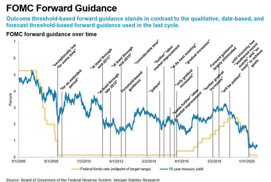 相信在很多篇关于美联储货币工具的文章,你都能看到“前瞻指引”这几个字。以前投资者们格外看重这份指引,因为这反映了美联储的政策观点,而往往,措辞中一个微小变动可能也会被市场放大理解,引发行情波动。