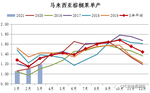 数据显示,马来西亚油棕树的鲜果串(FFB)单产为每公顷产16.73吨油,而2018年和2017年分别为17.19吨和17.89吨。马来的单产在2017年达到峰值,之后出现了目前的下降趋势。马来西亚产业主协会主席Jeffrey Ong表示,以目前马来西亚的种植物料,单产增长潜力能达到每公顷25至26吨,而目前偏低的局面受制于劳动力约束,这对我们理解棕榈油的上涨是有帮助的。