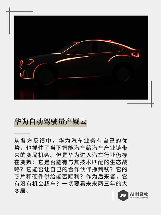 从各方的反馈中,华为有自己的优势。在智能车起步的时候,正是汽车产业链格局有可能发生改变的时候。但是华为进入汽车行业仍存在变数:它是否能有与技术匹配的生态战略?它能否让自己的合作伙伴挣到钱?它的芯片和硬件供给能否顺利?作为后来者,它有没有机会超车?一切要看未来两三年市场的大变局。
