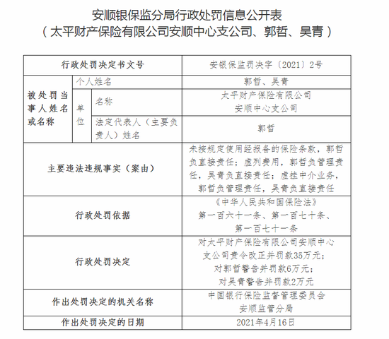 太平财险安顺中支被罚35万:未按规定使用经报备的保险条款