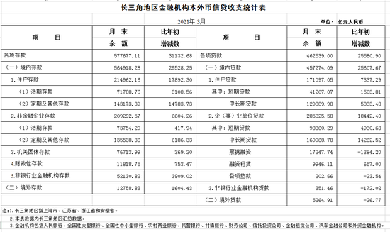 3月末,长三角地区本外币各项存款余额57.77万亿元,同比增长13.3%。月末长三角地区人民币存款余额55.47万亿元,同比增长12.8%,增速比上月末低1.7个百分点,比上年同期高1.6个百分点。
