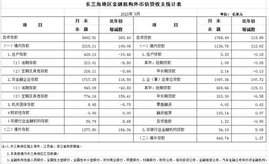 3月末,长三角地区外币存款余额3493亿美元,同比增长37.7%。一季度外币存款增加263亿美元,同比多增199亿美元。3月份外币存款减少13亿美元,同比少减69亿美元。