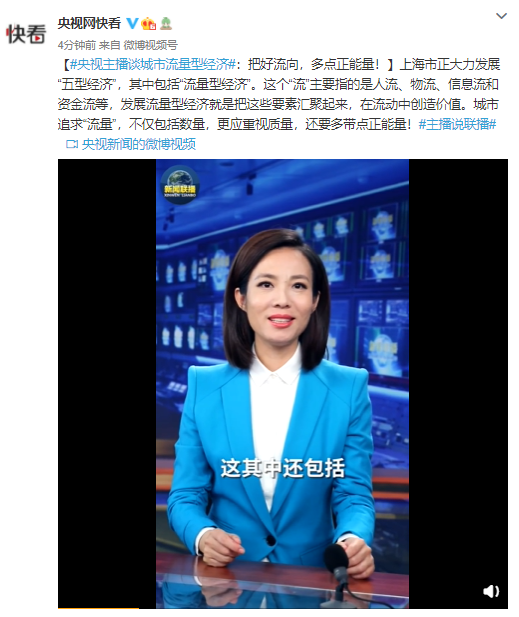 【#央视主播谈城市流量型经济#:把好流向,多点正能量!】上海市正大力发展“五型经济”,其中包括“流量型经济”。这个“流”主要指的是人流、物流、信息流和资金流等,发展流量型经济就是把这些要素汇聚起来,在流动中创造价值。城市追求“流量”,不仅包括数量,更应重视质量,还要多带点正能量!