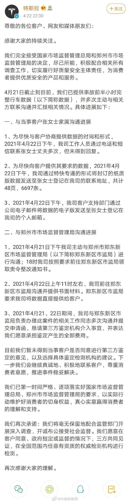 22日晚,特斯拉官方微博发布声明表示,完全接受国家市场监督管理总局和郑州市市场监督管理局的决定,尽己所能,积极配合相关所有调查工作,切实履行好质量安全主体责任,为消费者提供优质安全的产品和服务。