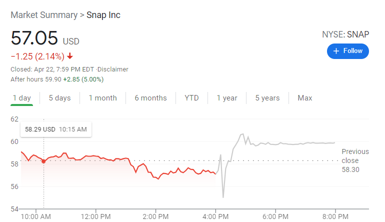 财报发布后,Snap股价盘后走高5%,报57.05美元。过去12个月,该股累计上涨了约235%。