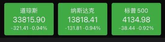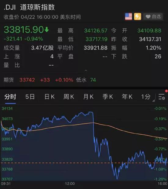 道指盘中从34126点迅速跳水,一度触及33717的低点,盘中重挫约400点。临近尾盘,道指反弹,收跌0.94%或321.41点。