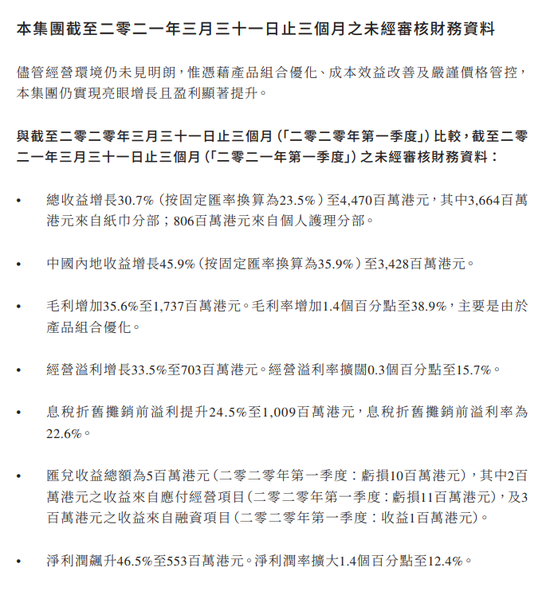 维达国际(03331)发布截至2021年3月31日止3个月未经审核第一季度业绩,该集团总收益增长30.7%(按固定汇率换算为23.5%)至44.7亿港元,其中36.64亿港元来自纸巾分部;8.06亿港元来自个人护理分部。中国内地收益增长45.9%(按固定汇率换算为35.9%)至34.28亿港元。