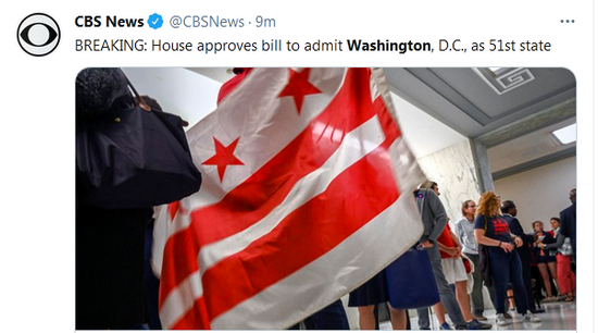 据环球网援引美国哥伦比亚广播公司消息,当地时间22日,美国众议院通过法案,批准华盛顿哥伦比亚特区为美国第51个州。