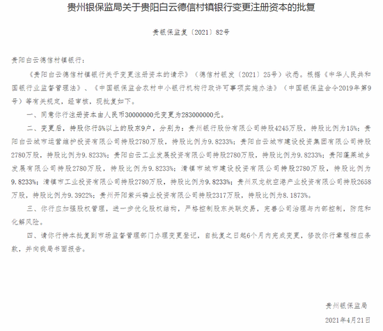 另外,行政许可信息表示,变更后,持股贵阳白云德信村镇银行5%以上的股东9户,分别为:贵州银行股份有限公司持股4245万股,持股比例为15%;贵阳白云城市运营维护投资有限公司持股2780万股,持股比例为9.8233%;贵阳白云城市建设投资集团有限公司持股2780万股,持股比例为9.8233%;贵阳白云工业发展投资有限公司持股2780万股,持股比例为9.8233%;贵阳蓬莱城乡发展有限公司持股2780万股,持股比例为9.8233%;清镇市城市建设投资有限公司持股2780万股,持股比例为9.8233%;清镇市工业投资有限公司持股2780万股,持股比例为9.8233%;贵州双龙航空港产业投资有限公司持股2658万股,持股比例为9.3922%;贵州开阳紫兴磷业投资有限公司持股2317万股,持股比例为8.1873%。