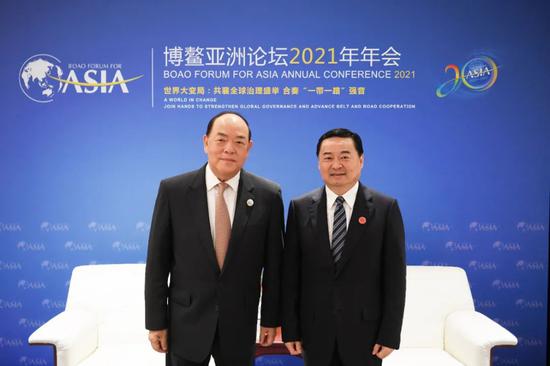 4月20日,国务院国资委党委书记、主任郝鹏在出席博鳌亚洲论坛2021年年会期间会见了澳门特别行政区行政长官贺一诚。双方就进一步推动中央企业助力澳门经济适度多元发展,参与粤澳(横琴)深度合作区、粤港澳大湾区建设等进行了深入交流。外交部驻澳门特别行政区特派员公署特派员刘显法,国务院国资委党委委员、秘书长彭华岗参加会见。