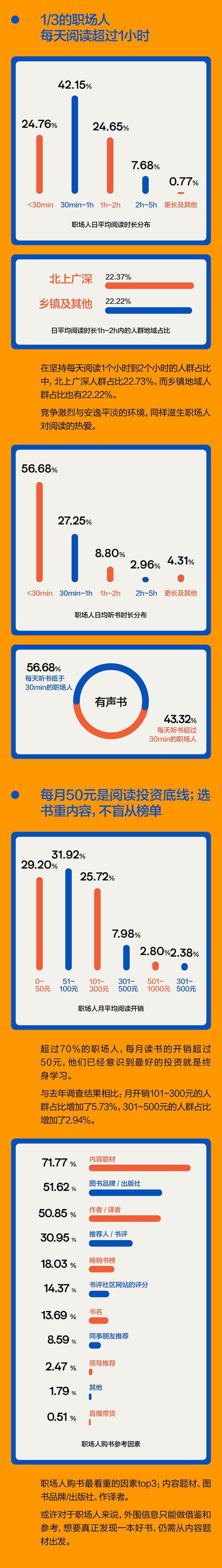超过70%的职场人,每月读书的开销超过50元。不过更值得点赞的是:月购书开销100-300元的人群,占比增加了约6%;月购书开销300-500元的人群,占比增加了约3%。买本好书,是最好的个人投资。