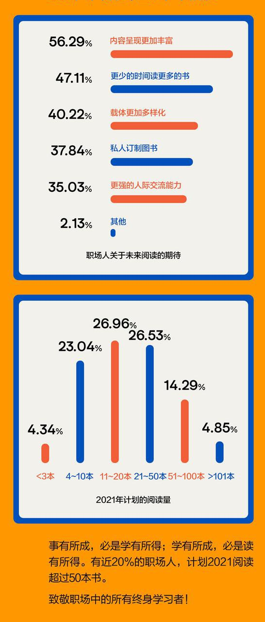调查显示,2021年职场人纸质书+电子书平均阅读量为19.54本,超过去年的18.75本。日拱一卒无有尽,终身学习给予了职场人“重塑”的勇气和行动能力。