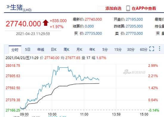 截至4月23日早盘收盘,生猪期货四个已挂牌合约均大幅上涨。生猪期货主力合约2109报27740元/吨,涨幅为1.97%。而生猪期货2201、2111、2203合约涨跌幅分别为0.93%、1.14%和0.06%。