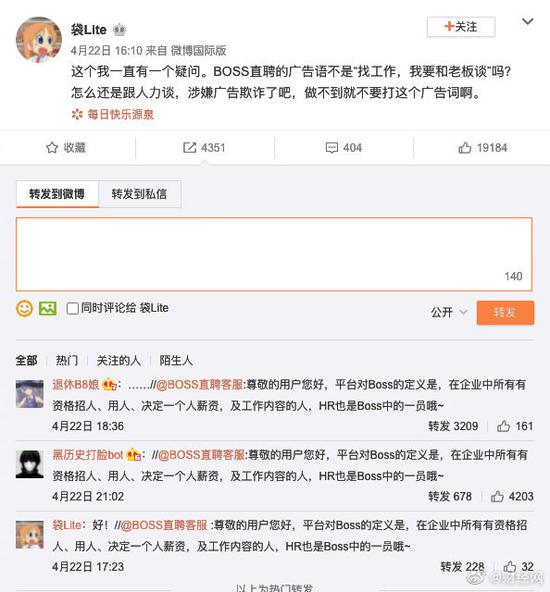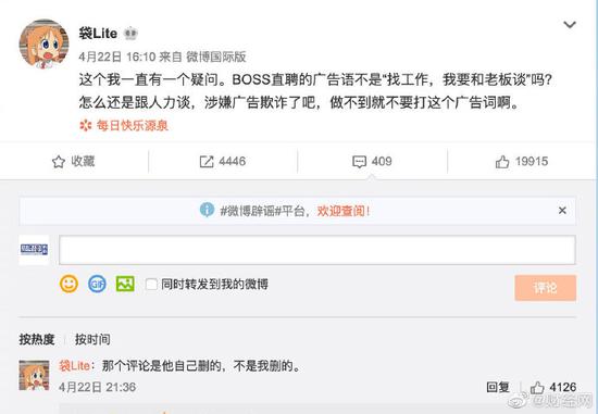 【?客服称HR也是BOSS的一员】有网友在微博发文质疑BOSS直聘的广告语“找工作,我要和老板谈”涉嫌广告欺诈,该网友表示不是直接跟老板谈吗,怎么还是跟人力谈?并表示BOSS直聘做不到就不要打这个广告词。据趣快排SEO科技报道,随后,BOSS直聘客服回复称平台对Boss的定义是在企业中所有有资格招人、用人、决定一个人薪资以及工作内容的人,并表明HR也是BOSS的一员。目前该网友评论下已无法找到这条回复,回复疑似被BOSS直聘客服删除。