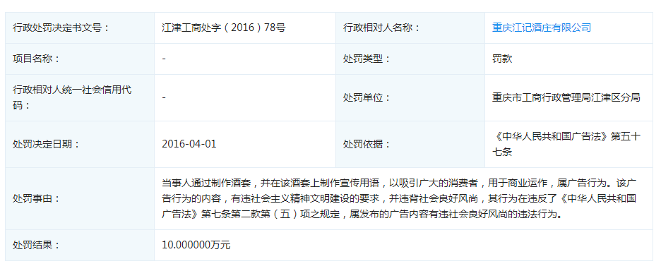 中国质量新闻网还查询到,2016年,重庆江记酒庄有限公司通过制作酒套,并在该酒套上制作宣传用语,以吸引广大的消费者,用于商业运作,属广告行为。该广告行为的内容,有违社会主义精神文明建设的要求,并违背社会良好风尚,其行为违反了《中华人民共和国广告法》第七条第二款第(五)项之规定,属发布的广告内容有违社会良好风尚的违法行为。重庆江记酒庄有限公司因上述违法行为被罚款10万元。
