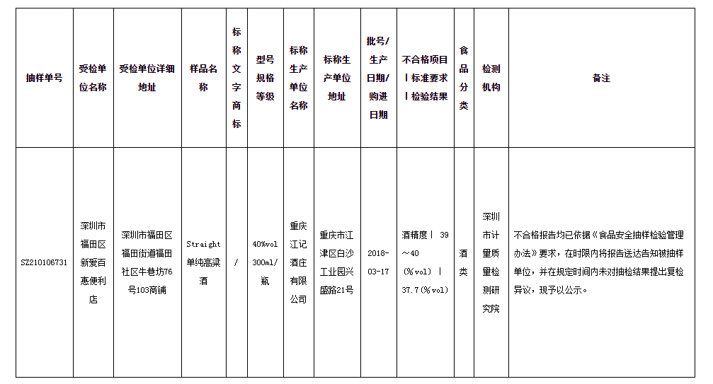 通告披露,不合格的酒类1批次为重庆江记酒庄有限公司(为重庆江小白酒业有限公司控股子公司,江小白持股99%股份)生产的Straight单纯高粱酒(型号规格等级:40%vol 300ml/瓶,批号/生产日期/购进日期:2018.3.17),不合格项目为酒精度(标准要求:39~40 (%vol),检验结果:37.7(%vol))。受检单位为深圳市福田区新爱百惠便利店。?