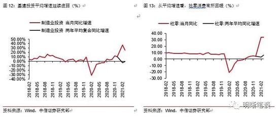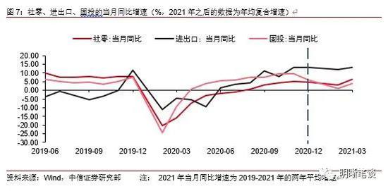 从需求端来看,地产仍维持较强韧性,基建、制造业投资有所回暖,消费延续复苏脚步。2021年1-3月地产、基建、制造业两年平均同比增速分别为7.6%(0pct)、2.3%(+3.9pcts)、-2.0%(+1.4pcts),地产投资仍维持在较高景气水平,施工、竣工对地产投资仍有支撑。基建投资也随着施工条件改善、专项债资金逐渐下达而有所反弹。值得关注的点在于制造业投资仍维持在偏弱状态,原因或与当前制造业库存相对较高有关,但制造业投资已有逐渐修复迹象,随着工业企业利润延续上行,预计后续制造业投资仍有回暖空间。消费方面,年初受国内部分地区疫情散点爆发+就地过年政策推出扰动春节经济影响,消费表现整体偏弱,但进入3月后,随着上述因素的逐渐弱化,消费重回修复脚步。