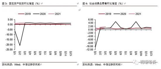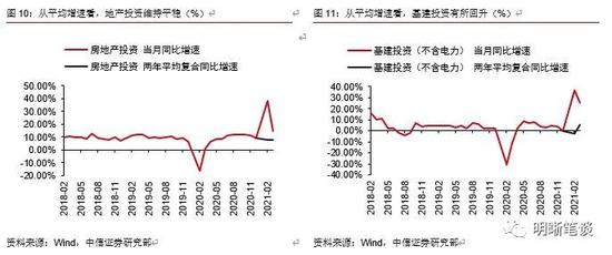 年均复合增速也是一个剔除基数效应的方法,主要是通过2021年相较于2019年同期的两年平均增速来估算当前经济相较于常态化水平(2019年)的冷暖情况。这种方法可以帮助我们分析不同行业的各自表现,同时也可以剔除环比数据的季节性特征。此类方法具有较多优势之处:第一,与环比增速和PMI指数相比,年均复合增速可以下沉到行业维度,比如国家统计局公布了基建、地产、制造业等行业的年均复合增速,同时我们也可以自行手动计算采矿业以及制造业子行业的年均复合增速,行业适用范围较广是年均复合增速法的优点;另一方面,通常环比数据具有一定的季节性特征,以PMI数据为例,受假期影响,通常春节所在月份以及10月的PMI数据会较前月有所下行,而年均复合增速法可以剔除此类因素的影响。具体来看,2021年1-2月,工业生产、固定资产投资、社会消费品零售较2019年1-2月的两年平均增速分别为8.1%、1.7%、3.2%;2021年1-3月工业生产、固定资产投资、社会消费品零售的两年平均增速分别为6.8%、2.9%、4.2%,3月工业生产有所降速,但投资端与消费端均有所回暖。