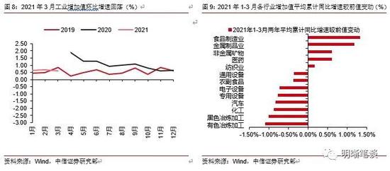 生产端,3月工业生产环比增速与年均复合增速双双回落印证工业景气度下行,但从行业视角看,当前工业生产放缓既有需求侧的原因,同时也有供给侧的因素在。具体而言,由于年均复合增速可以较好的分析不同行业之间的冷暖,我们从不同行业增加值的年均复合增速入手,可以看到导致3月工业增加值年均复合增速回落的行业主要为有色、黑色、化工、汽车、电子设备。其中,汽车、电子设备制造业的生产放缓或与3月出口增速回落有关(2021年1-3月出口两年平均累计同比增速为13.5%,低于1-2月的年均增速15.2%),有色、黑色、化工生产放缓的原因这可能与环保限产加码有关。因此,生产放缓可能并不意味着经济环比动能将逐渐回落。