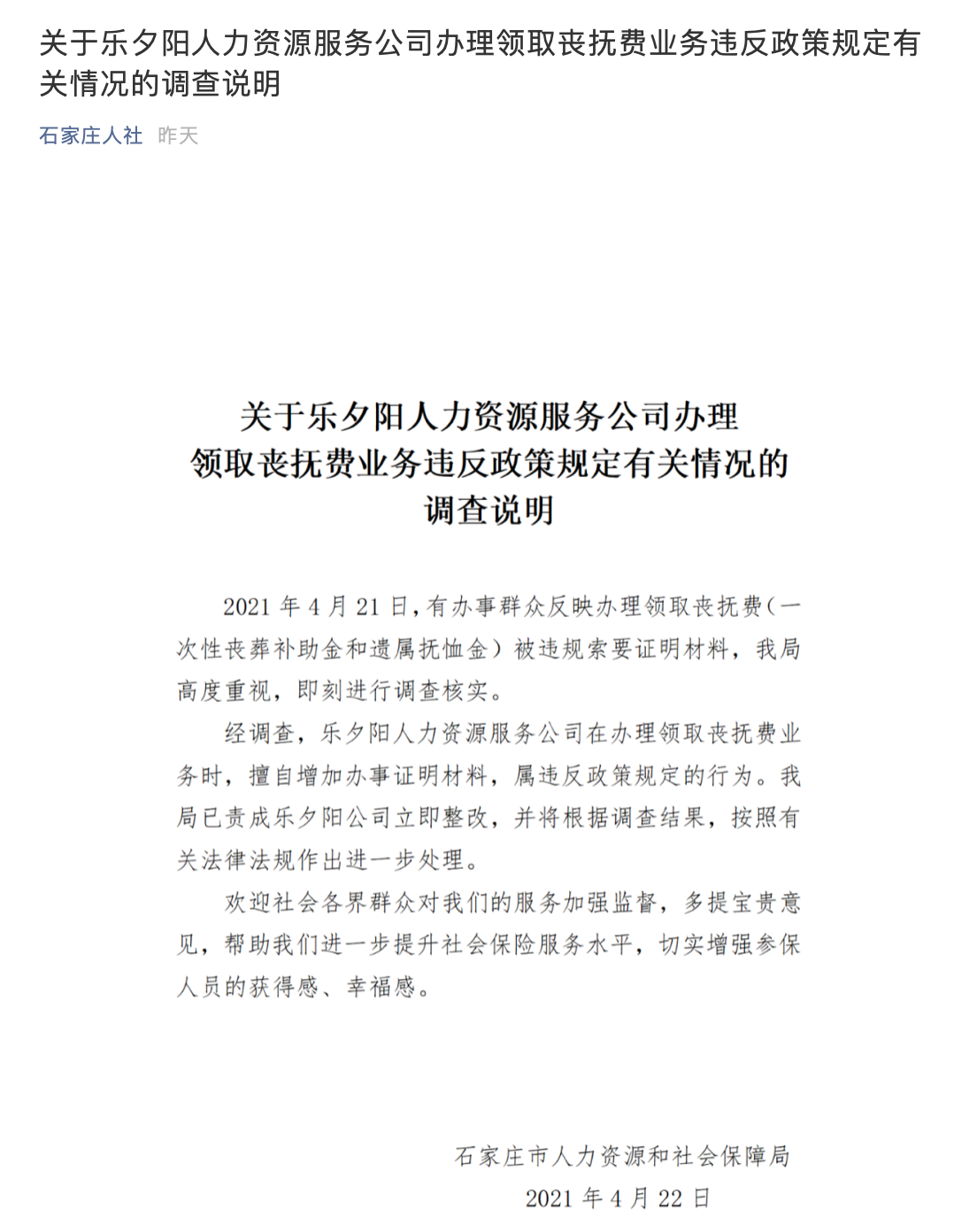 :领丧抚费需死者生前无犯罪证明?石家庄人社局通报:违规,已责成涉事公司立即整改