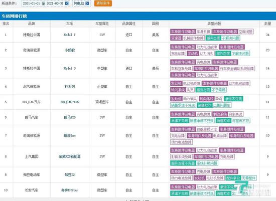 但钛媒体App查询车质网最新投诉统计数据则显示,到2021年第一季度,投诉量已经到了排名第一的位置,仅三个月的Model3和Model Y的投诉总量就已达到48次,投诉量前五名的车型,特斯拉占了两款。