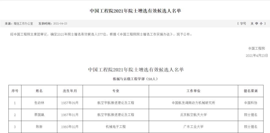 中国工程院4月23日在官网发布消息称,经中国工程院主席团审议,确定2021年院士增选有效候选人577位,根据《中国工程院院士增选工作实施办法》,现予公布。