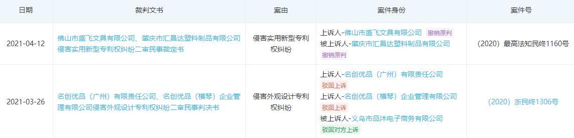 涉名创优品最新的两则裁判文书分别在3月26日和4月12日发布,案由分别为“侵害外观设计专利权纠纷”和“侵害实用新型专利权纠纷”。其中3月26日的裁判文书显示,法院一审判决名创优品及名创优品横琴公司停止销售、制造品沐公司相关专利产品,并分别赔偿品沐公司15000元、30000元。法院二审驳回名创优品及名创优品横琴公司上诉,维持一审判决结果。