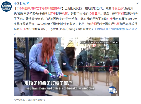 【#环保组织打碎汇丰总部19扇窗户#】当地时间周四,在地球日当天,数名环保组织“反抗灭绝”成员来到伦敦金丝雀码头汇丰银行总部,砸碎了大楼的19扇窗户。随后,这些环保活跃分子坐了下来,静候警察逮捕。“反抗灭绝”的一份声明称,此次行动是为了抗议汇丰虽宣布要在2050年实现净零碳足迹,却依然与化石燃料企业有联系。此前,该组织还对英国央行总部和巴克莱银行伦敦总部进行过类似破坏。(视频 Brian Chang 记者 陈靖怡)
