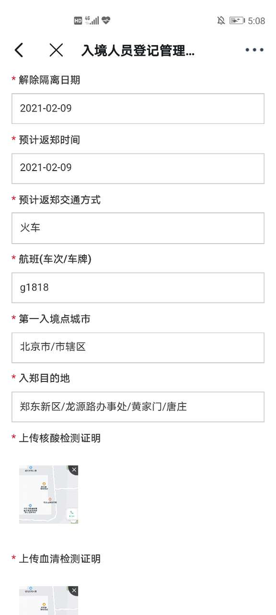 入郑目的地:填报抵达郑州后目的地