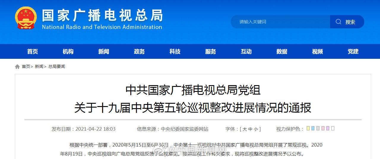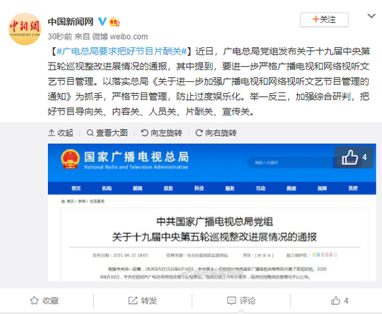 近日,广电总局党组发布关于十九届中央第五轮巡视整改进展情况的通报,其中提到,要进一步严格广播电视和网络视听文艺节目管理。以落实总局《关于进一步加强广播电视和网络视听文艺节目管理的通知》为抓手,严格节目管理,防止过度娱乐化。举一反三,加强综合研判,把好节目导向关、内容关、人员关、片酬关、宣传关。