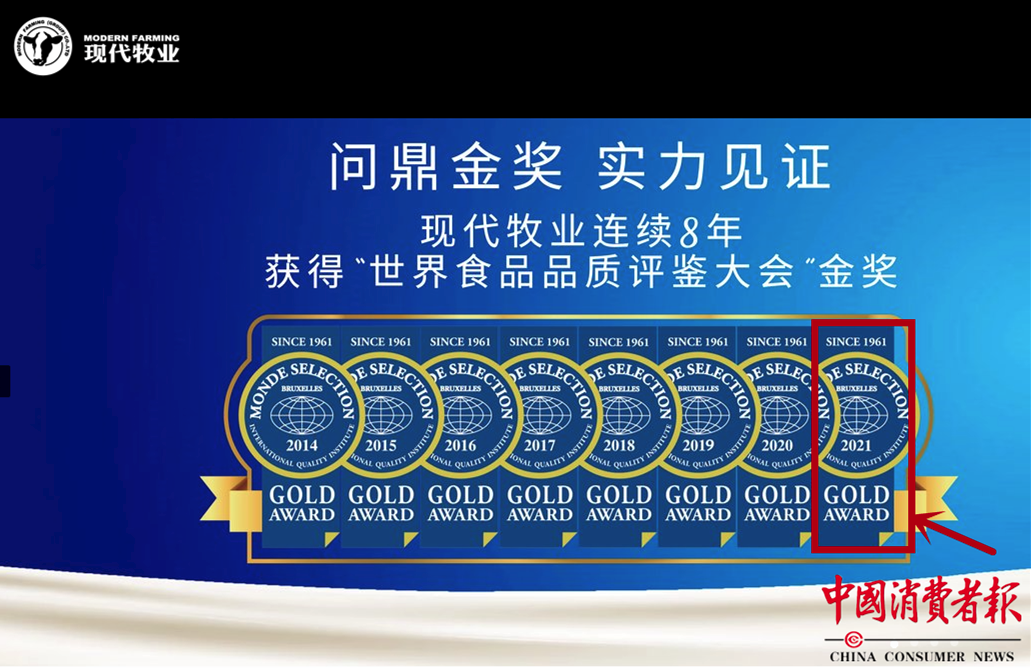 在现代牧业官方网站上,一排金奖标识图案上方打出了“现代牧业连续8年获得世界食品品质评鉴大会金奖”的宣传,更不可思议的是,在2021年奖项还未公布的情况下,现代牧业已经将2021年的金奖挂在了官网上。