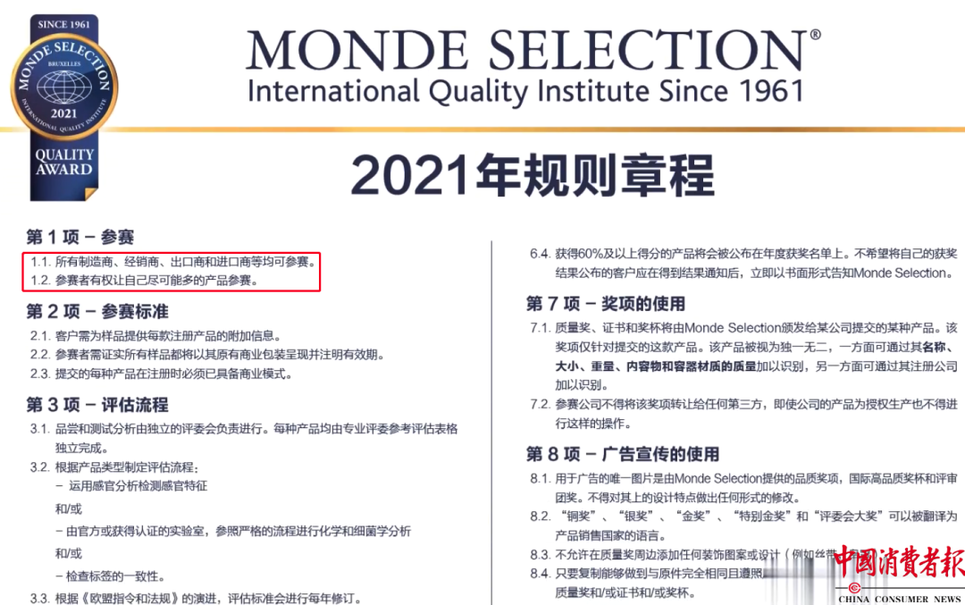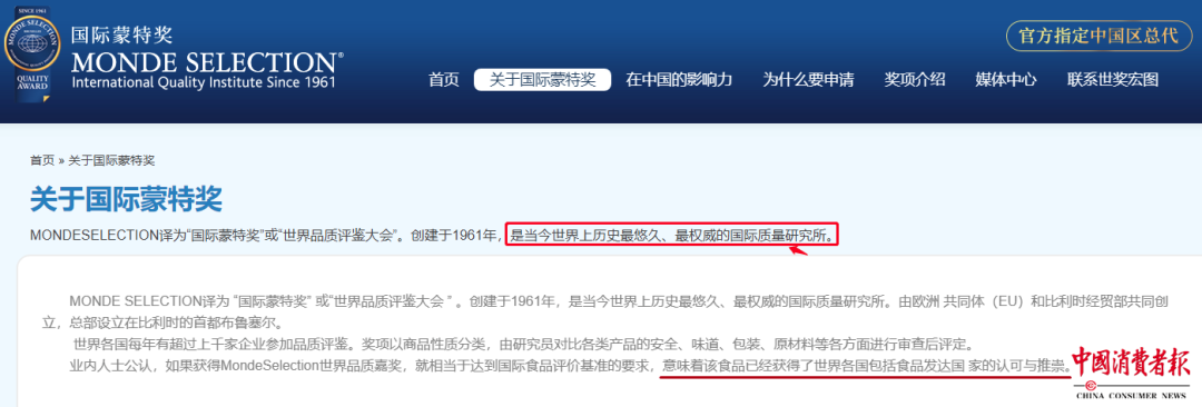 记者调查发现,“世界食品品质评鉴大会”在中国大陆地区的代理商为上海日云商务咨询有限公司(以下简称“日云商务”)。在“日云商务”网站上,有一段关于该奖项的中文介绍,其中这样一句话被众多获奖企业引用:“MondeSelection创建于1961年,是当今世界上历史最悠久、最权威的国际质量研究所。”而记者调查发现,该机构比利时官方网站上并没有表明其为当今世界上历史最悠久、最权威的质量研究机构。