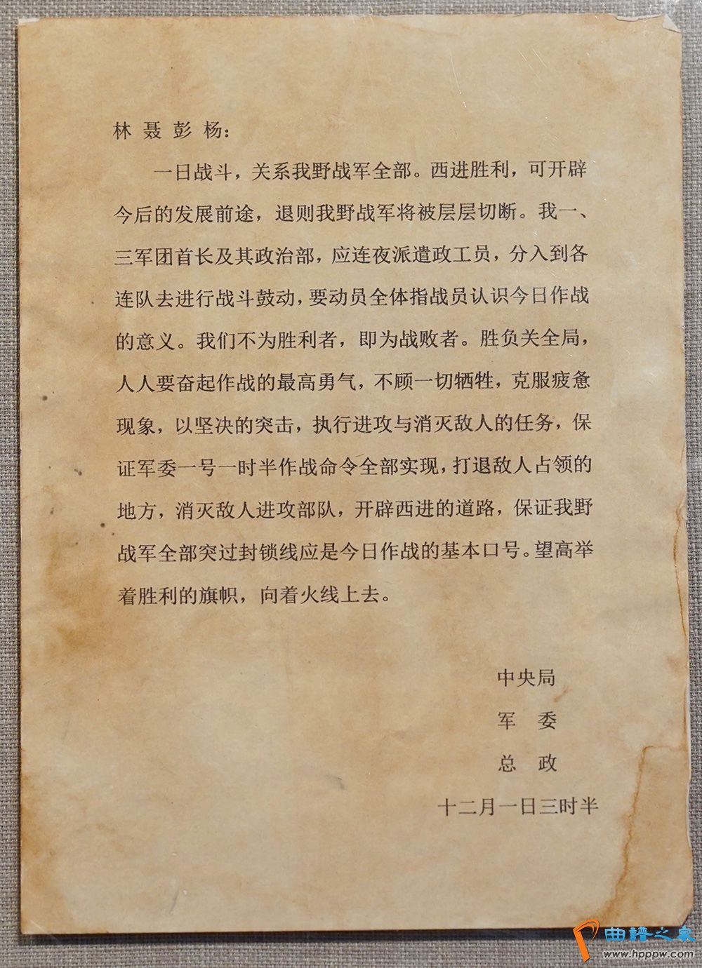 12月1日凌晨,中央红军在湘江南北两翼部署的阻击线都被压到了绝境,生死存亡的最后时刻到了。中共中央、中革军委、红军总政治部联合发出紧急电报,下达“我们不为胜利者,即为战败者”“高举着胜利的旗帜,向着火线上去”的军令。