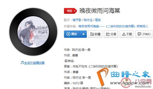这首歌是《二哈和他的白猫师尊》燃晚的同人歌曲,歌名叫做《晚夜微雨问海棠》,是由歌手镜予歌 / 陈亦洺 / 哗笑演唱的。