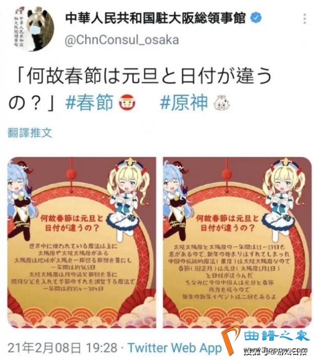 无独有偶,中国驻大阪总领事馆也可能说是原神的老同伙了。正在春节时刻,驻大阪总领事馆就行使了原神里的高人气脚色甘雨和芭芭拉来担负“现象大使”,为表洋的同伙科普起了咱们的春节文明。