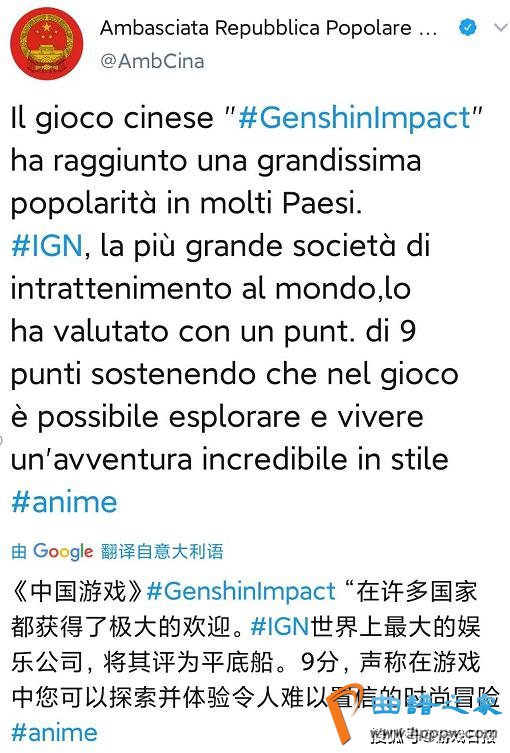 早正在原神刚公测不久时,由于其正在海表的高人气以及IGN上9分以上的高分,惹起了中国驻意大利大使馆的合怀,大使馆于是向老表们先容起了原神的实质。不但如斯,正在前不久的国庆节时,驻意大利大使馆还正在线上应接会中行使了原神的12首游戏音笑当BGM,还正在应接会结尾为此展现谢谢。