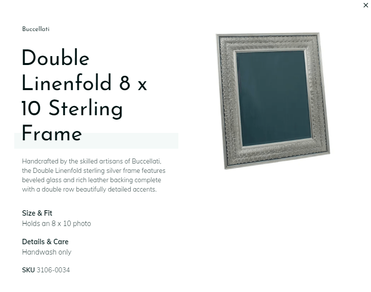 画框、相框也是婚礼礼品清单上的高频率产生的物品,帕丽斯枚举了不少100美元操纵的平价相框供客人拣选。当然也有像Buccellati如此腾贵的画框,下图由意大利银匠专家手工造造的这款画框标价为3200美元,已被某位客人抢购。