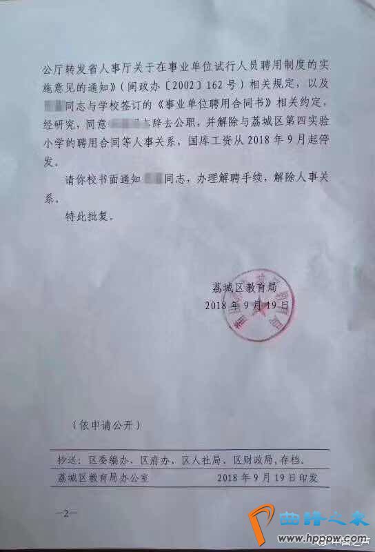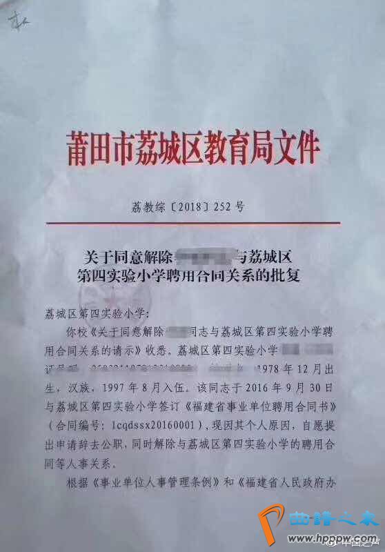网上还宣扬着一份题名为荔城区培植局9月19日的,该文献是发给荔城区第四实践幼学的,要紧实质是因师长片面起因,志愿提出申请辞去公职,培植局批复赞同袪除这名西席和学校的人事相闭。有家擅长是将此文献和微信截图相干正在沿途,正在朋侪圈显示,微信截图中的“廖师长”仍然被解职。