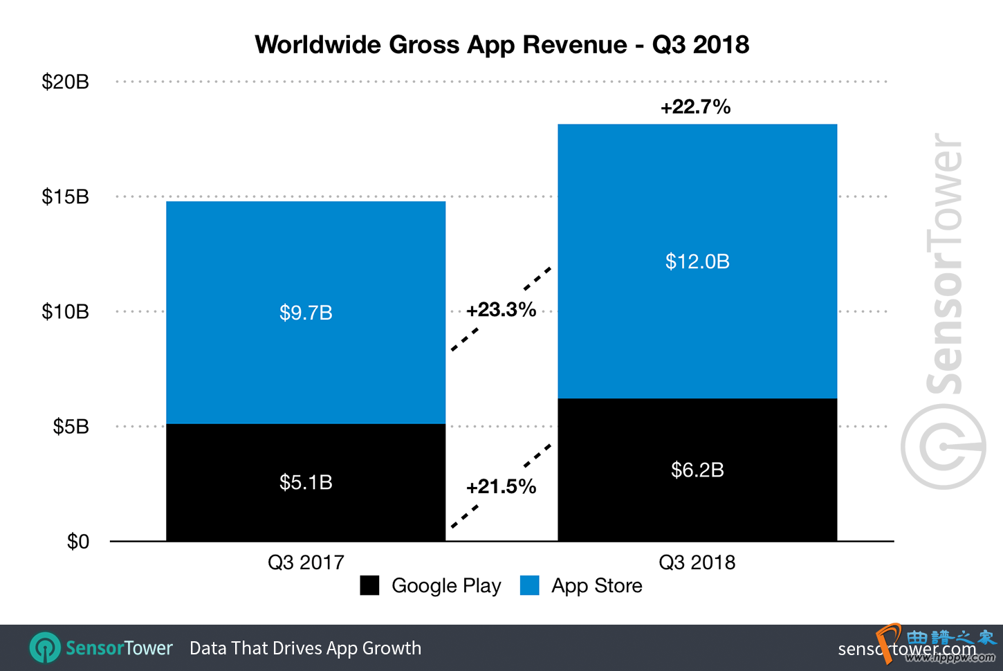 10月11日,据Apple Insider征引转移利用数据理解公司Sensor Tower发表的陈说显示,2018年第三季度环球转移利用收入达182亿美元,较客岁同期的148亿美元上涨22。7%。