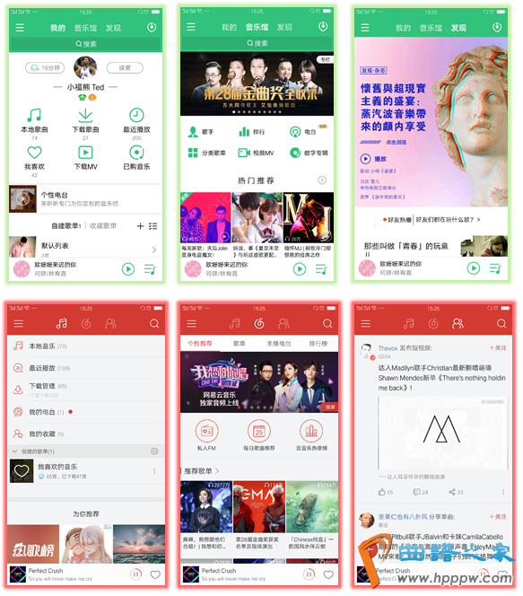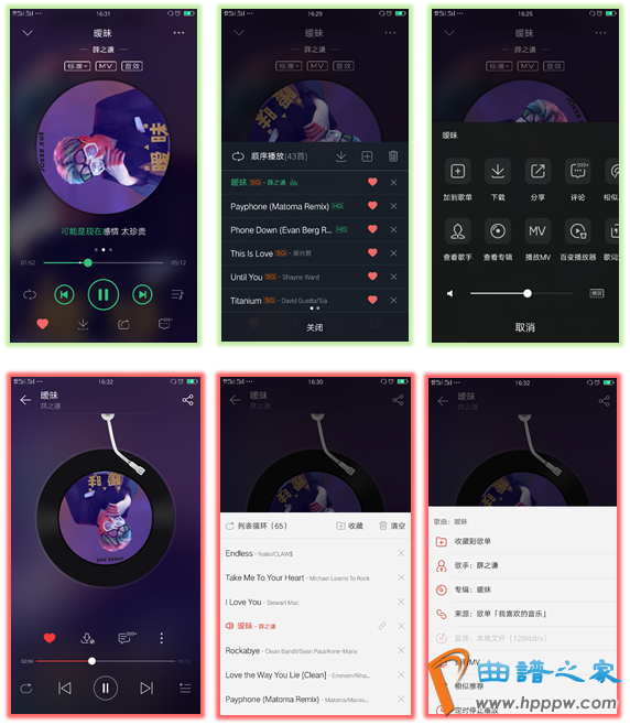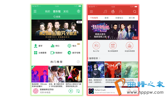 色彩上以绿色为主色调的靠山下会有赤色元素如锺爱、SQ等按钮或标识,显得有些花哨,比拟之下,网易云音笑利用高度同一的颜色赤色,大气而简短。而且弹出的功效页是蓝玄色而歌单列表页的靠山是黑灰色,没有保留一律;而网易云音笑都保留雷同的白色靠山,既简短明净又高度同一。