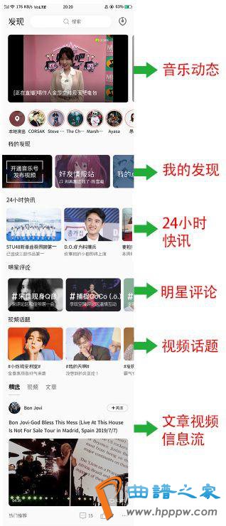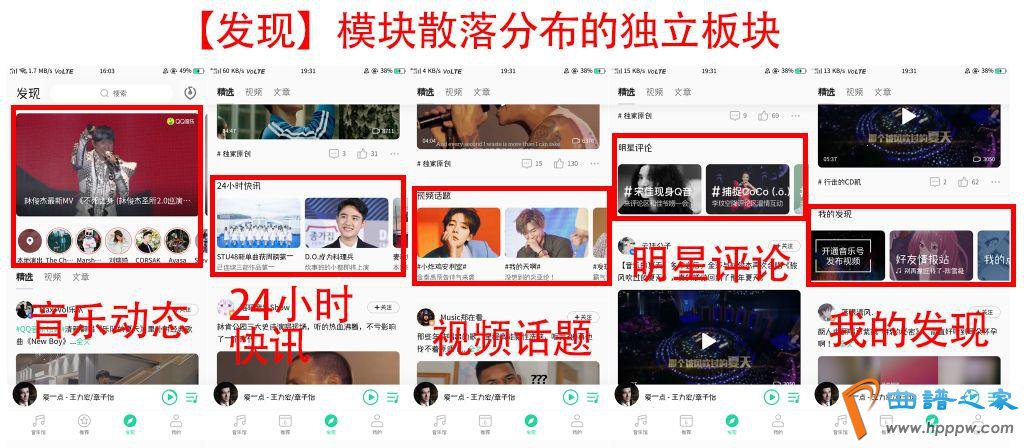 上图是笔者对【发觉】页面的片面实质板块的UI调动事后的成就界面,将“24幼时疾讯”、“视频话题”、“明星评论”、“我的发觉”固定正在页面顶部,促运用户正在浏览社区实质时,进入这些板块发觉他们感兴会的视频、歌曲和实质。再往下翻阅,浏览到其他更新的实质。